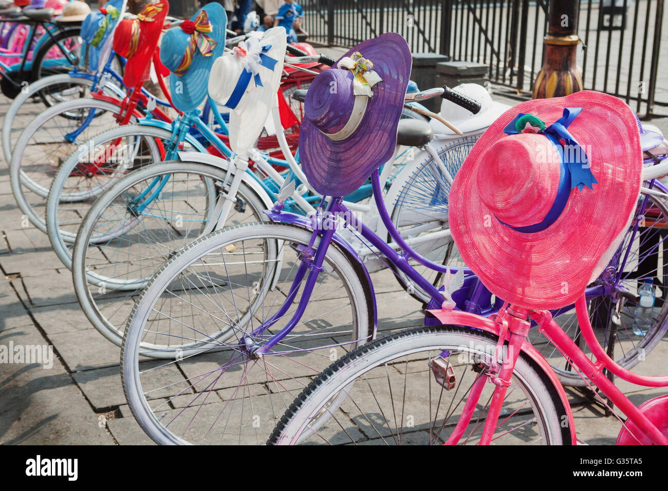 Vecchia Moto Colorati Con Hipster Design Su Strada Con Vintage Stile Classico Donna Cappelli E Stile Retro Caschi Da Bicicletta Foto Stock Alamy